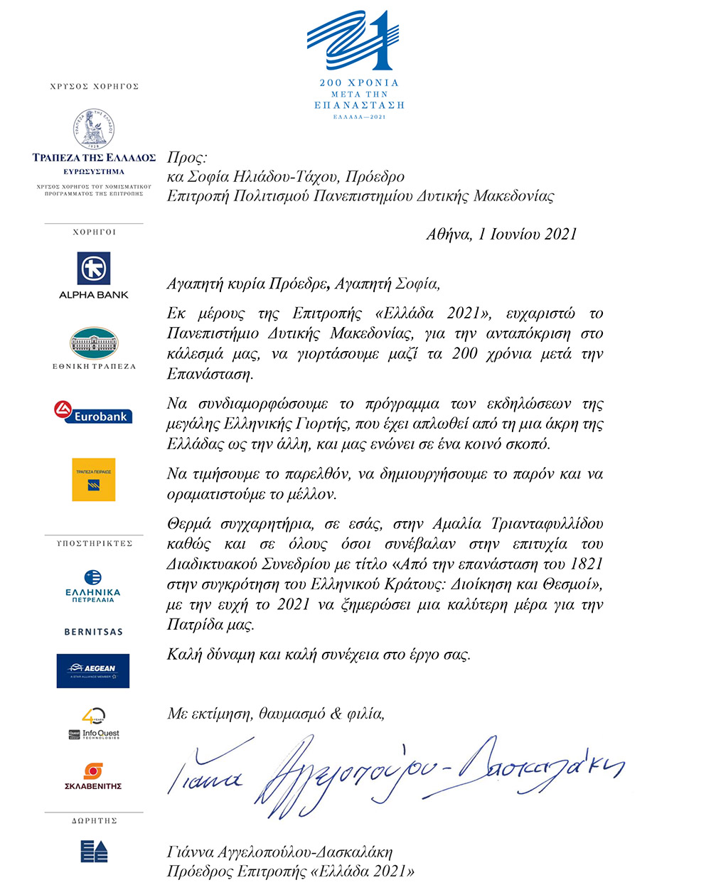 Συγχαρητήρια επιστολή απέστειλε η Πρόεδρος της Επιτροπής «Ελλάδα 2021» κ. Γιάννα Αγγελοπούλου Δασκαλάκη στην Πρόεδρο της Επιτροπής Πολιτισμού του Πανεπιστημίου Δυτικής Μακεδονίας Καθηγήτρια Σοφία Ηλιάδου Τάχου, για τη διοργάνωση του συνεδρίου «Ο Πόλεμος της Ανεξαρτησίας και η Συγκρότηση του Ελληνικού Κράτους. Σύγχρονες Ερμηνείες», στο πλαίσιο των εκδηλώσεων εορτασμού των 200 χρόνων από την Ελληνική Επανάσταση.