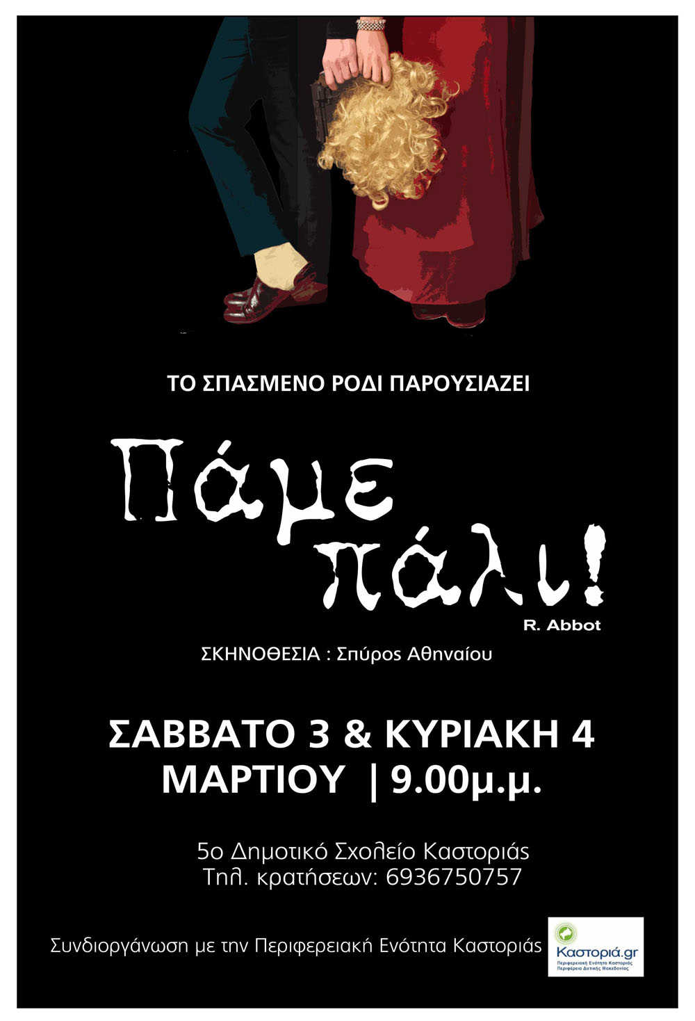 Για όλους όσους, λοιπόν, δεν κατάφεραν αλλά ήθελαν πολύ να δουν την παράσταση, αλλά και για όσους θέλουν να την ξαναδούν, αποφασίσαμε να πραγματοποιηθούν ακόμα 2 παραστάσεις, μετά τις Απόκριες, το Σάββατο 3 και την Κυριακή 4 Μαρτίου, στον ίδιο χώρο του 5ου Δημοτικού και ώρα 21:00μμ. Μπορείτε να κάνετε την κράτησή σας από τώρα! Θα χαρούμε να σας έχουμε και πάλι κοντά μας!