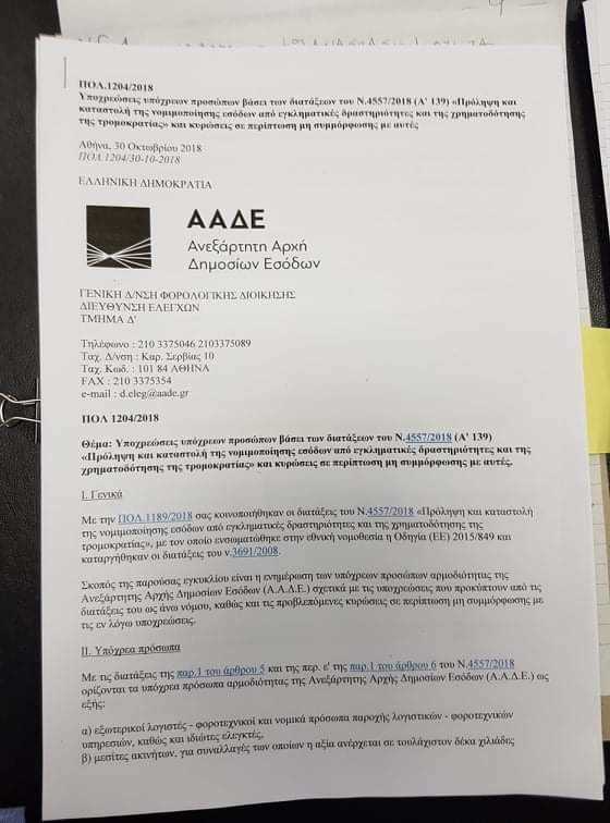 3.Η ΠΟΛ. 1204/2018 στην οποία αναφέρεται ο κος Αναστασίου εκδόθηκε από την ΑΑΔΕ(Ανεξάρτητη αρχή δημόσιων εσόδων) στις 30/10/2018 και καθορίζει τις υποχρεώσεις υπόχρεων προσώπων βάσει τον παραπάνω νόμου 4557/2018