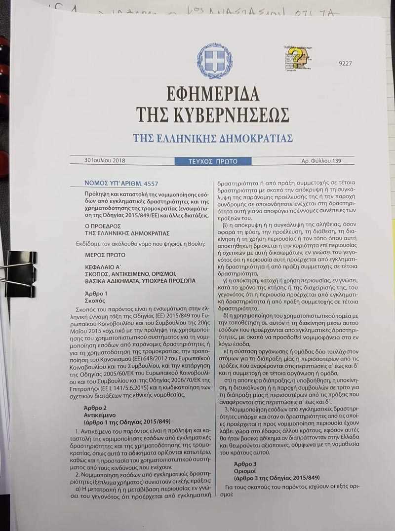 2.Ο νόμος που αναφέρεται ο κος Αναστασίου είναι ο 4557/2018   στο άρθρο 1 αναφέρει: Σκοπός του παρόντος είναι η ενσωμάτωση στην ελληνική έννομη τάξη της οδηγίας (Ε.Ε) 2015/849 του ευρωπαϊκού κοινοβουλίου σχετικά με την πρόληψη της χρησιμοποίησης του χρηματοπιστωτικού συστήματος για την νομιμοποίηση εσόδων από παράνομες δραστηριότητες ή για χρηματοδότηση της τρομοκρατίας. ”Αποστέλλω φωτογραφία της πρώτης σελίδας”