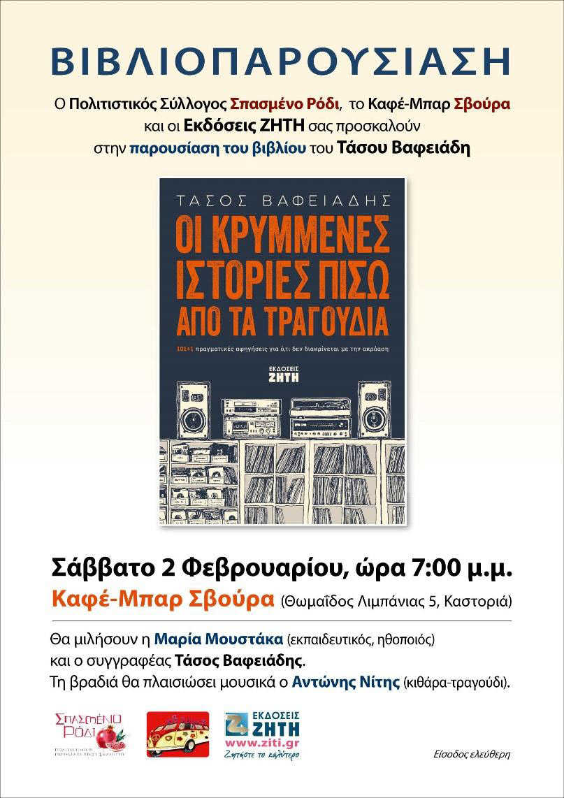 Ο πολιτιστικός σύλλογος Σπασμένο Ρόδι, το καφέ-μπαρ «σβούρα» και οι Εκδόσεις ΖΗΤΗ σας προσκαλούν στην παρουσίαση βιβλίου του Τάσου Βαφειάδη “Οι κρυμμένες ιστορίες πίσω από τα τραγούδια “, το Σάββατο 2 Φεβρουαρίου στις 7:00 μ.μ. στο χώρο του καφέ «σβούρα».