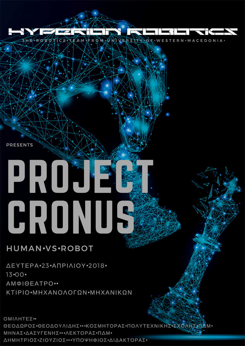 H Πολυτεχνική Σχολή του Πανεπιστημίου Δυτικής Μακεδονίας, σας προσκαλεί στην παρουσίαση του Project Cronus από την ομάδα Hyperion Robotics, που θα πραγματοποιηθεί τη Δευτέρα, 23 Απριλίου 2018 κα ώρα 13:00, στο Αμφιθέατρο του Τμήματος Μηχανολόγων Μηχανικών (Μπακόλα και Σιαλβέρα).