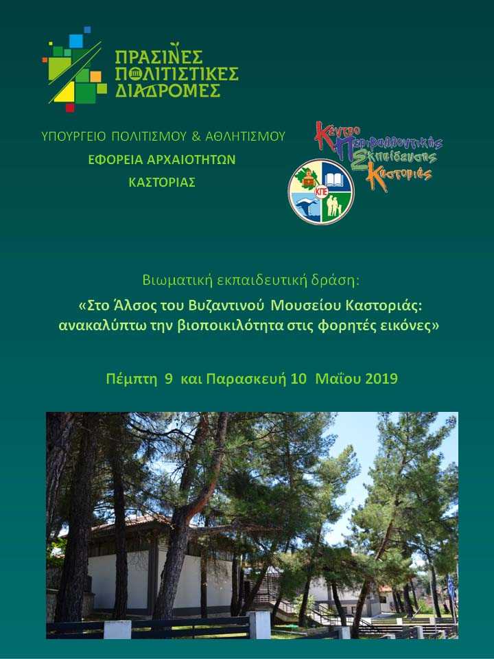 Στην βιωματική εκπαιδευτική δράση με τίτλο «Στο Άλσος του Βυζαντινού Μουσείου Καστοριάς: ανακαλύπτω τη βιοποικιλότητα στις φορητές εικόνες», που απευθύνεται σε σχολικές ομάδες Δ΄, Ε΄ και ΣΤ΄ τάξης Δημοτικού.