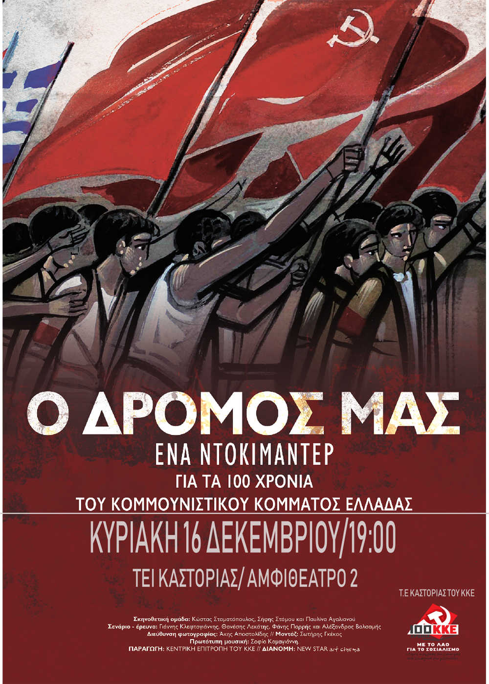 H Τομεακή Επιτροπή Καστοριάς του ΚΚΕ την Κυριακή 16 Δεκεμβρίου 2018 διοργανώνει εκδήλωση που θα περιλαμβάνει την παρουσίαση του Ντοκιμαντέρ , για 100 χρόνια από την ίδρυση του Κομμουνιστικού Κόμματος Ελλάδας ” Ο δρόμος μας”. Η προβολή του ντοκιμαντέρ θα πραγματοποιηθεί στο ΤΕΙ Καστοριάς, στο αμφιθέατρο Α2 στις 19:00.