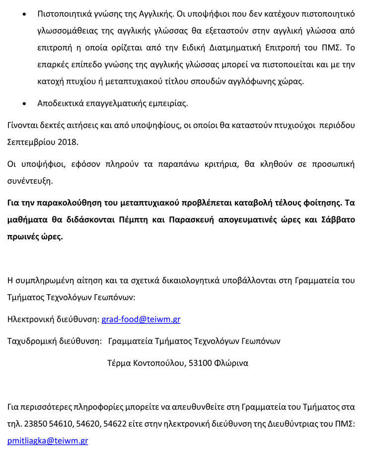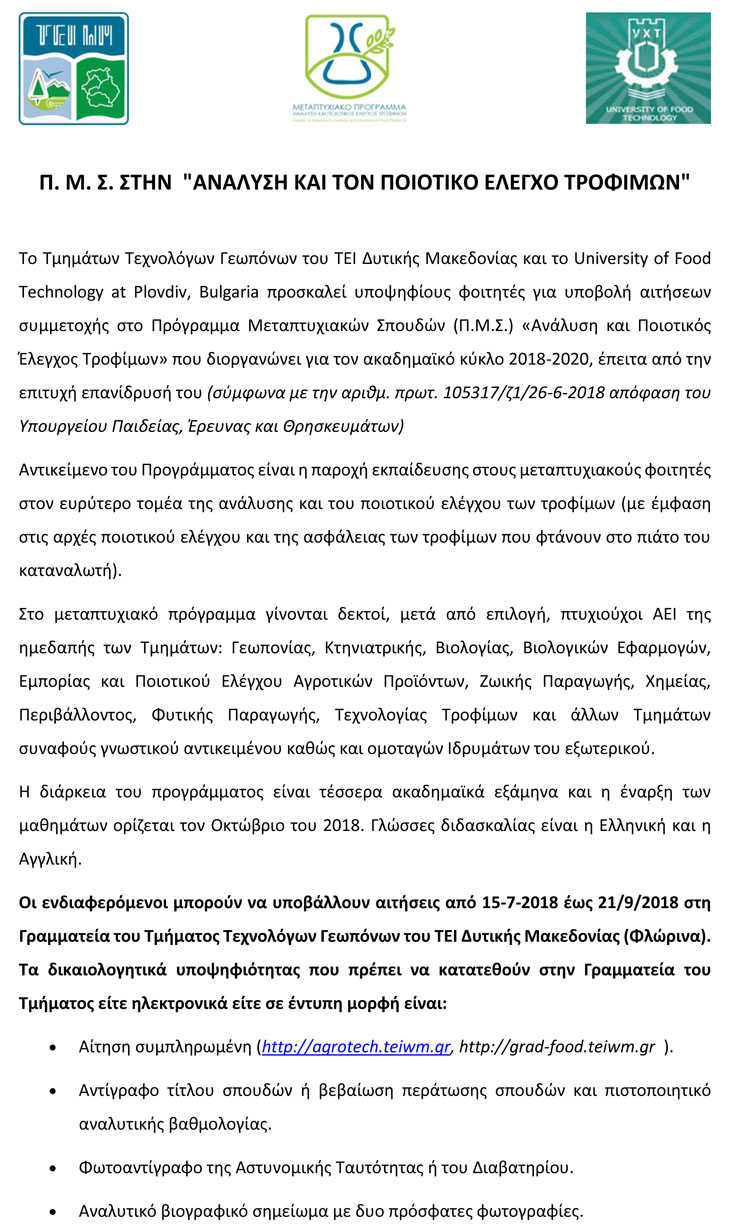 Προκήρυξη ΜΠΣ «Ανάλυση και Ποιοτικός Έλεγχος Τροφίμων» του Τμήματος Τεχνολόγων Γεωπόνων του ΤΕΙ Δυτικής Μακεδονίας στη Φλώρινα