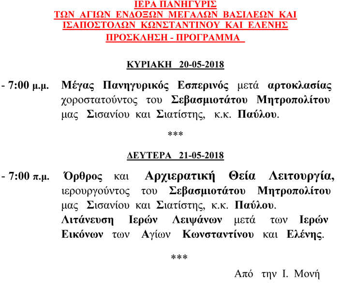 Πρόγραμμα εορτασμού Ιεράς Μονής Αγίων Κωνσταντίνου και Ελένης Βογατσικού