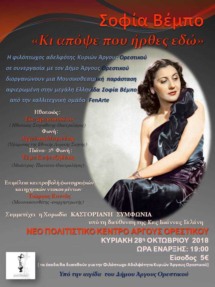 Ώρα  7  μ.μ.       Μουσικοθεατρική παράσταση της Φιλοπτώχου Αδελφότητας Κυριών Άργους Ορεστικού, σε συνεργασία με τον Δήμο, αφιερωμένη στη Σοφία Βέμπο από την καλλιτεχνική ομάδα FenArte, στο Πολιτιστικό Κέντρο Άργους Ορεστικού.