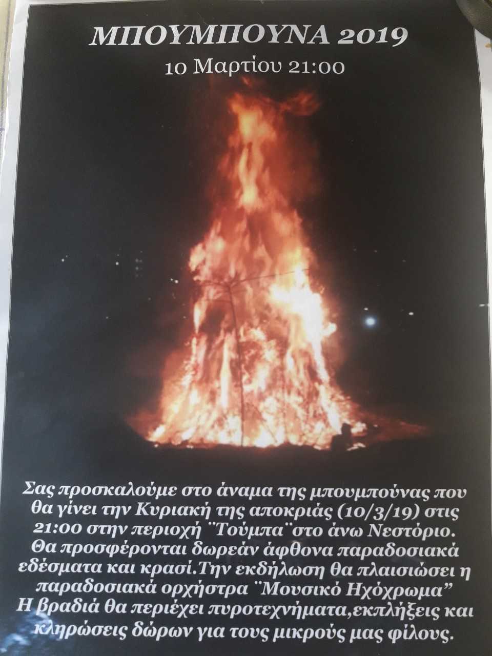 Σας προσκαλούμε στο άναμμα της “Μπουμπούνας” την Κυριακή της Αποκριάς (10/03/2019) και ώρα 21:00 στην περιοχή Τούμπα του Άνω Νεστορίου.