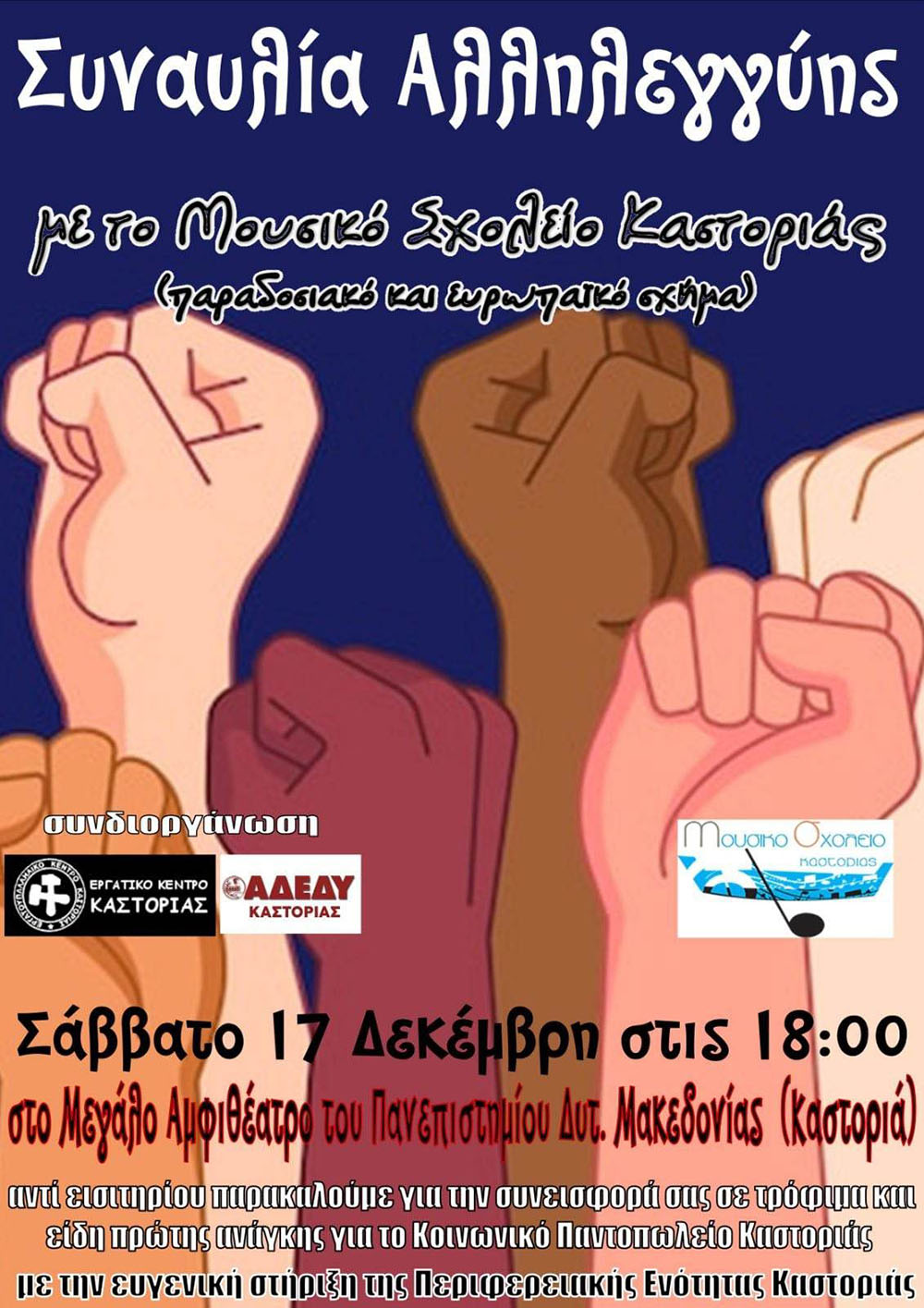 Ο Σύλλογος Εκπαιδευτικών Π.Ε. Ν. Καστοριάς συμμετέχει στην εκδήλωση – μουσική βραδιά, που συνδιοργανώνει το ΝΤ ΑΔΕΔΥ Καστοριάς μαζί με το Εργατικό Κέντρο Καστοριάς το Σάββατο 17 Δεκεμβρίου 2022 και ώρα 18:00 στο μεγάλο Αμφιθέατρο του Πανεπιστημίου Δυτικής Μακεδονίας (πρώην ΤΕΙ) με σκοπό την συλλογή τροφίμων, τα οποία θα διατεθούν στο Κοινωνικό Παντοπωλείο Καστοριάς.