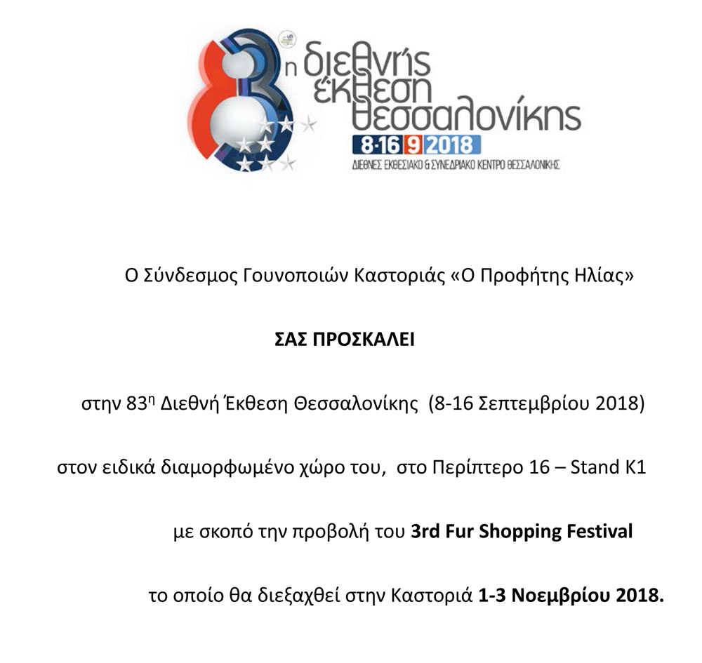 Το 3rd Fur Shopping Festival, που θα διεξαχθεί στην Καστοριά 1 – 3 Νοεμβρίου 2018, θα προβάλλει στην Διεθνή Έκθεση Θεσ/νίκης ο Σύνδεσμος Γουνοποιών Καστοριάς «Ο Προφήτης Ηλίας»