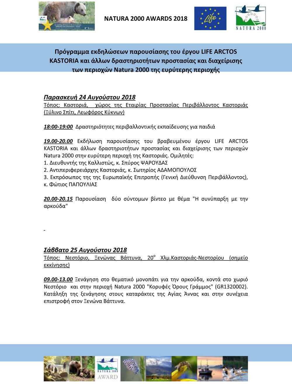 Η επιτυχής εκπλήρωση των στόχων του έργου LIFE ARCTOS KASTORIA, αναγνωρίστηκε σε ευρωπαϊκό επίπεδο τόσο με την κατάκτηση του βραβείου Best of the Best LIFE projects 2018, στην κατηγορία «Φύση & Βιοποικιλότητα», όσο και την βράβευση στον θεσμό των Natura 2000 Awards στην κατηγορία «Συμβιβασμός συμφερόντων /απόψεων». Με αφορμή το επιτυχημένο παράδειγμα του LIFE ARCTOS KASTORIA, στην εκδήλωση θα παρουσιαστούν και άλλες δυνατότητες υποστήριξης της διαχείρισης των περιοχών Natura 2000 στην Περιφερειακή Ενότητα Καστοριάς.