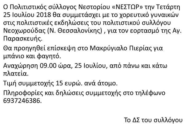 Συμμετοχή του Συλλόγου “ΝΕΣΤΩΡ” στις πολιτιστικές εκδηλώσεις του συλλόγου Νεοχωρούδας για τον εορτασμό της Αγ. Παρασκευής