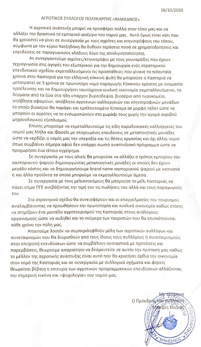 Σύσκεψη είχε χθές 16-10-2020 ο αγροτικός σύλλογος Πολυκάρπης «Μακεδνος» με τον αντιπεριφερειάρχη στο γραφείο του για να συζητήσει τα αιτήματα του αγροτικού συλλόγου να συμμετέχει στην γνωμοδοτική επιτροπή επενδύσεων της δίκαιης μετάβασης (επισυναπτόμενο έγγραφο).