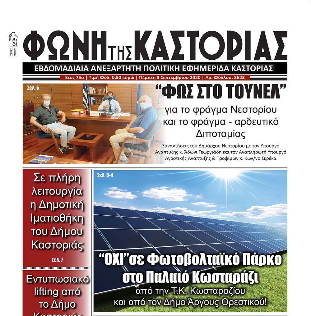 Το πρωτοσέλιδο της εφημερίδας μας “ΦΩΝΗ ΤΗΣ ΚΑΣΤΟΡΙΑΣ” | 03 / 09 / 2020