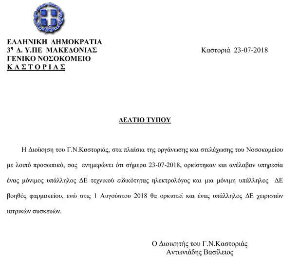 Συνεχίζεται η στελέχωση του Γ.Ν. Καστοριάς