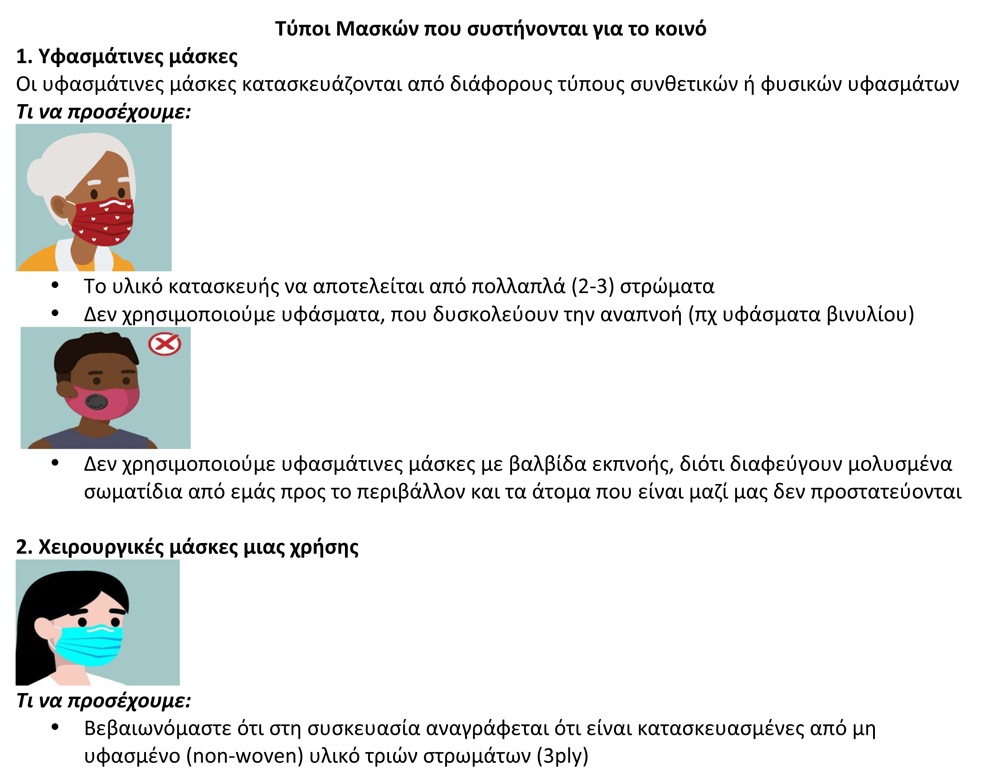 Α. Η αναγκαιότητα για καθολική χρήση της μάσκας από το ευρύ κοινό, σε εσωτερικούς και εξωτερικούς χώρους. Οι εμβολιασμένοι κατά της covid-19 δεν εξαιρούνται από την υποχρεωτική χρήση της μάσκας.