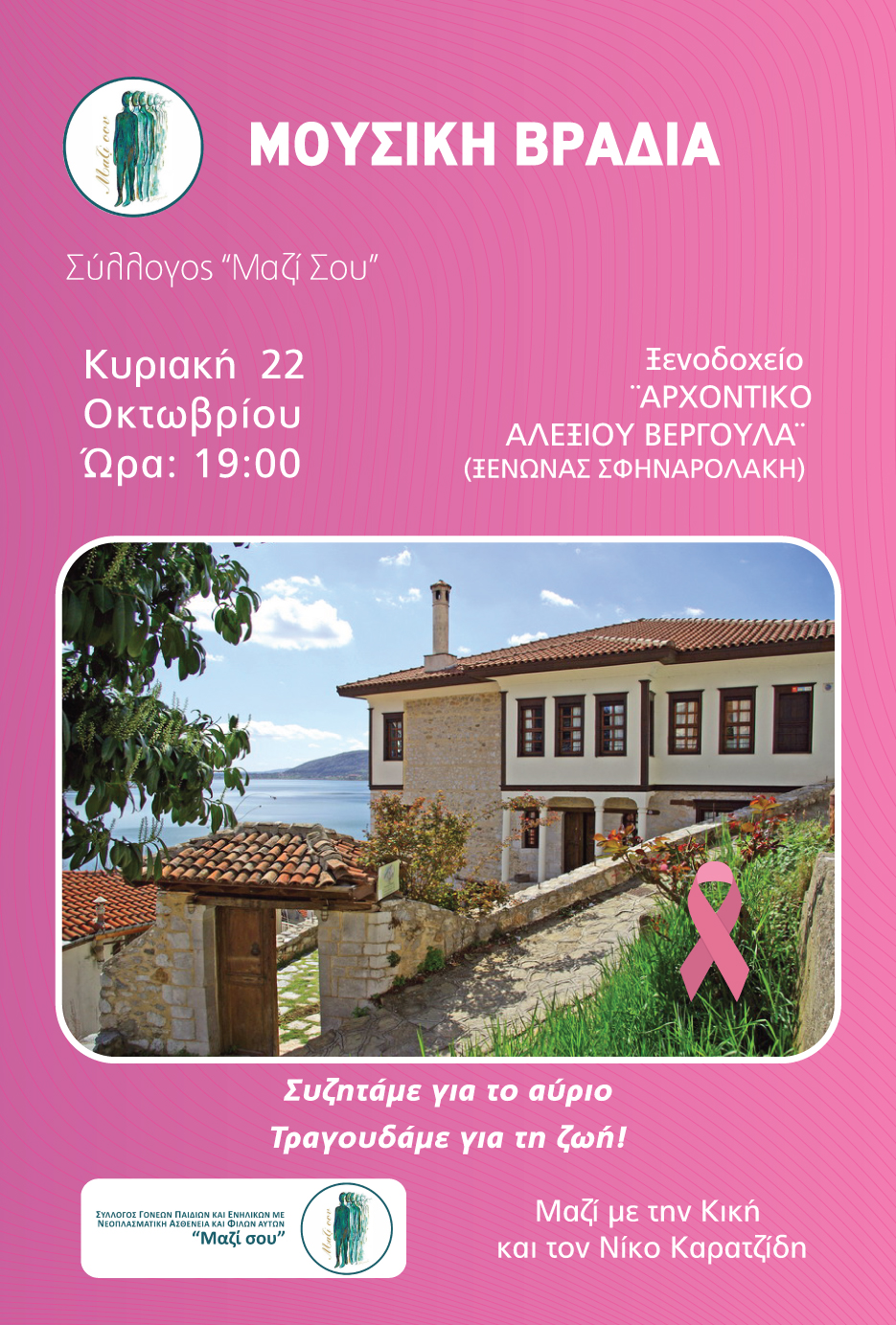 Σκοπός μας είναι, να βρεθούμε στον όμορφο χώρο του ξενοδοχείου ¨ΑΡΧΟΝΤΙΚΟ ΑΛΕΞΙΟΥ ΒΕΡΓΟΥΛΑ¨ να συζητήσουμε για το αύριο με χαμόγελο, να τραγουδήσουμε, για τη ζωή, τα υπέροχα τραγούδια που θα μας χαρίσει οι μουσικοί μας και στο τέλος της βραδιάς να δούμε όλοι μας την επόμενη ημέρα πιο αισιόδοξη και φωτεινή.