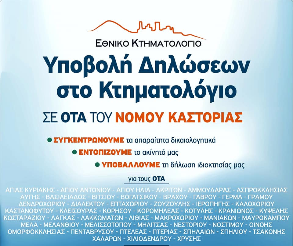 Σύντομα (περί τα τέλη Νοεμβρίου) στην Περιφερειακή Ενότητα Καστοριάς και στους Ο.Τ.Α. Αγίας Κυριακής, Αγίου Αντωνίου, Αγίου Ηλία, Ακριτών, Αμμουδάρας, Ασπροκκλησιάς, Αυγής, Βασιλειάδος, Βιτσίου, Βογατσικού, Βράχου, Γάβρου, Γέρμα, Γράμου, Δενδροχωρίου, Διαλεκτού, Επταχωρίου, Ζούζουλης Ιεροπηγής, Καλοχωρίου, Καστανοφύτου, Κλεισούρας, Κορησού, Κορομηλέας, Κοτύλης, Κρανιώνας, Κυψέλης, Κωσταραζίου, Λάγκας Λακκωμάτων, Λιθιάς, Μακροχωρίου, Μανιάκων, Μαυρόκαμπου, Μελά, Μελανθίου, Μελισσότοπου, Μηλίτσας, Νεστορίου, Νοστίμου, Οινόης, Ομορφοκκλησιάς, Πενταβρύσου, Πτελέας, Πτεριάς, Σπηλαίων, Σπήλιου, Τσάκονης, Χαλάρων, Χιλιοδένδρου και Χρυσής θα ξεκινήσει η κτηματογράφηση με τη δήλωση όλων των εμπραγμάτων ή άλλων εγγραπτέων δικαιωμάτων (π.χ. πλήρης ή ψιλή κυριότητα, επικαρπία, προσημείωση ή άλλο εμπράγματο βάρος, κ.λπ.) που έχουν τα φυσικά ή νομικά πρόσωπα στις εν λόγω περιοχές και η σύνδεση των δικαιωμάτων αυτών με συγκεκριμένο(α) ακίνητο(α), όπως αυτά ορίζονται και απεικονίζονται κατόπιν διαδικασιών ελέγχου και τεχνικής επεξεργασίας στα κτηματολογικά διαγράμματα.