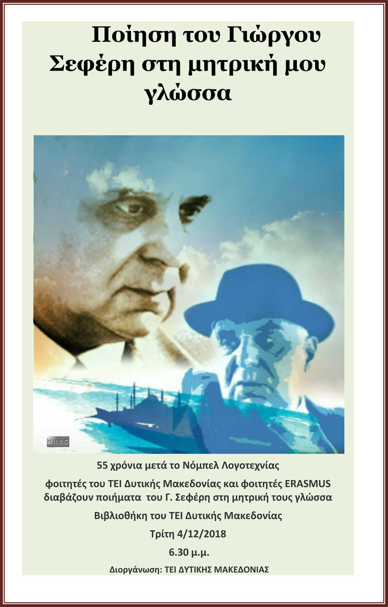 Την Τρίτη 4 Δεκεμβρίου στη Βιβλιοθήκη του ΤΕΙ Δυτ. Μακεδονίας στις 6.30 μ.μ. φοιτητές του ΤΕΙ Δ. Μακεδονίας και φοιτητές Erasmus με αφορμή τα 55 χρόνια από την απονομή του Νόμπελ Λογοτεχνίας στον Γιώργο Σεφέρη διαβάζουν ποιήματά του στη μητρική τους γλώσσα.