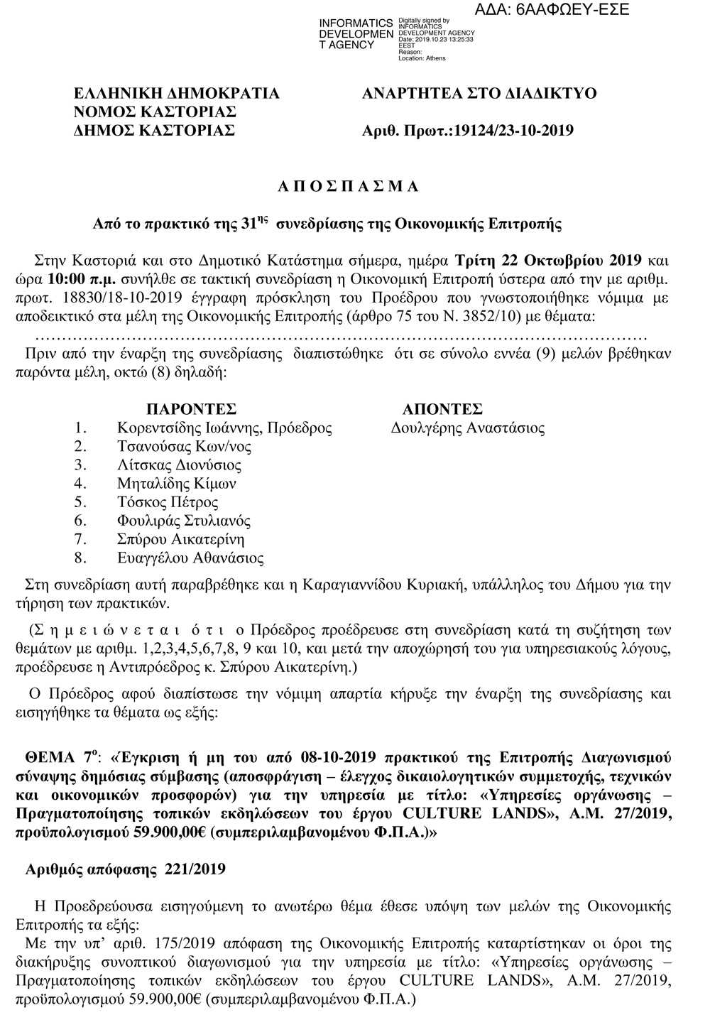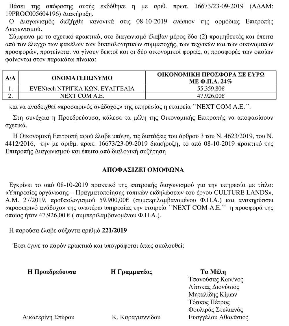 Απόφαση Οικονομικής Επιτροπής 2019/221 Έγκριση ή μη του από 08-10-2019 πρακτικού της Επιτροπής Διαγωνισμού σύναψης δημόσιας σύμβασης του έργου CULTURE LANDS