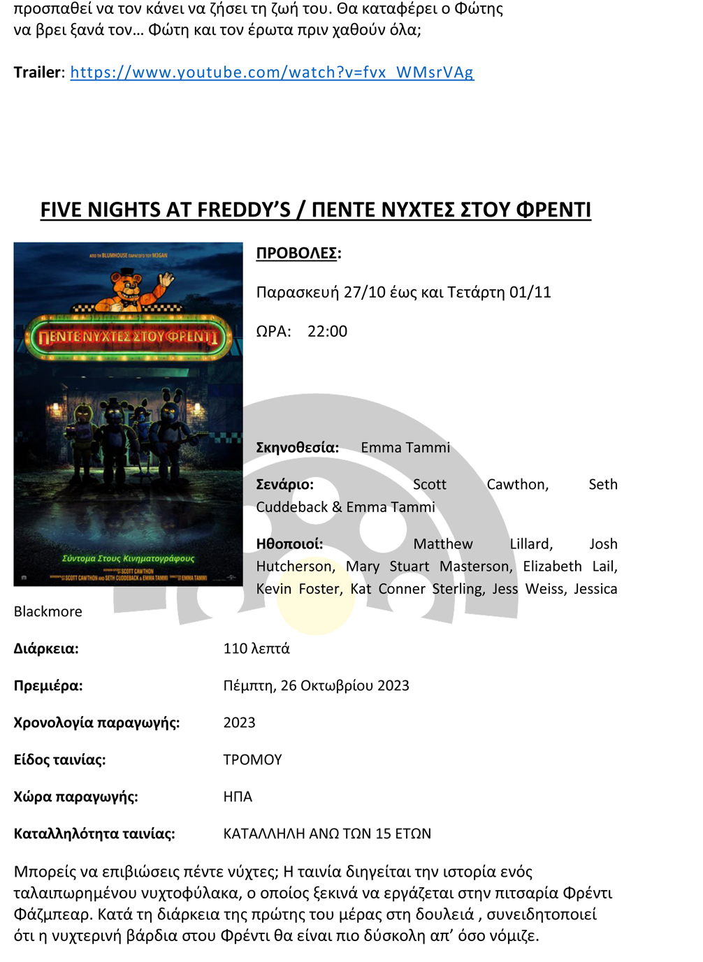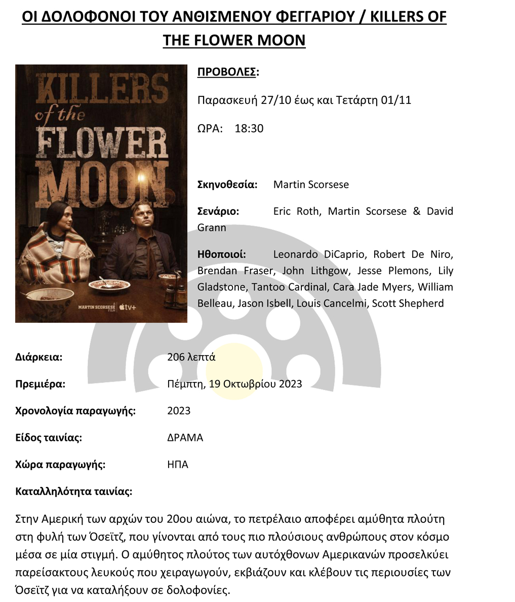 Το πρόγραμμα του χειμερινού κινηματογράφου ΟΛΥΜΠΙΟΝ 27/10-01/11 26/10/202326/10/2023 Ταινίες & Σειρές Προπώληση εισιτηρίων https://www.more.com/theater/pollaploi-horoi/theatro-skion-athanasiou-anargyrou/ Τιμή εισιτηρίου 6€ Share this Facebook Messenger Twitter Pinterest Whatsapp Email fonikastorias Τελευταία άρθρα Press trip Σλοβένων δημοσιογράφων στην Καστοριά με στόχο τη διεθνή προβολή της περιοχής Το σκίτσο της εβδομάδας από τον Δημήτρη Ιατρού Το πρόγραμμα της "Μουσικής Άνοιξης" 2026 Ξεκίνησε η προπώληση για τη συναυλία της Κατερίνας Λιόλιου στην Πολυκάρπη Καστοριάς Δείτε τα όλα Προηγούμενο Άρθρο Ειδική και τακτική συνεδρίαση του Δημοτικού Συμβουλίου Καστοριάς (δείτε τα θέματα) Επόμενο Άρθρο Διοργάνωση συλλαλητηρίου διαμαρτυρίας για το υπέρογκο κόστος της ενέργειας αποφάσισαν οι φορείς της Καστοριάς (φωτο) Τελευταία από Ταινίες & Σειρές Το πρόγραμμα του χειμερινού κινηματογράφου ΟΛΥΜΠΙΟΝ 23-29/4 Το πρόγραμμα του χειμερινού κινηματογράφου ΟΛΥΜΠΙΟΝ 16-22/4 Το πρόγραμμα του χειμερινού κινηματογράφου ΟΛΥΜΠΙΟΝ 09-15/4 Το πρόγραμμα του χειμερινού κινηματογράφου ΟΛΥΜΠΙΟΝ 02-08/4 FIFF on the road: Το 1ο Florina International Film Festival ταξιδεύει σε Αμύνταιο και Πρέσπες Το Florina International Film Festival συνεχίζει τη δυναμική του πορεία, φέρνοντας τον κινηματογράφο πιο κοντά στο