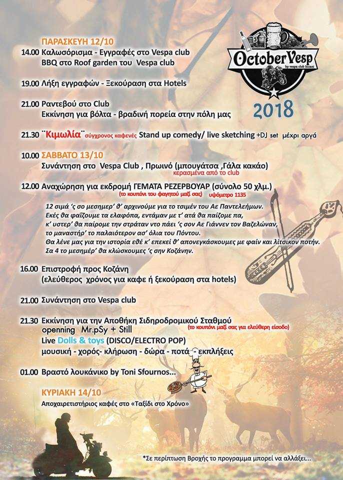 Οι εκδηλώσεις φέτος ξεκινούν την Παρασκευή 12 και ολοκληρώνονται την Κυριακή 14 Οκτωβρίου. Η υποδοχή των Vespisti θα γίνει και φέτος στις εγκαταστάσεις του VC Κοζάνης στην οδό 3ης Σεπτεμβρίου 11. Μουσική, χορός και τοπικά εδέσματα θα συνθέσουν το σκηνικό της υποδοχής ταυτόχρονα με τις εγγραφές. Η πρώτη μέρα ολοκληρώνεται με stand-up comedy και live sketching στον σύγχρονο καφενέ «Κιμωλία» στον οποίο οι vespisti θα φτάσουν μετά την καθιερωμένη βραδινή βόλτα στους κεντρικούς δρόμους της πόλης.
