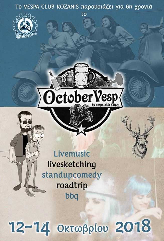 Η ώρα για το 6ο OctoberVesp που διοργανώνει κάθε χρόνο το Vespa Club Κοζάνης έφτασε! Για 6η συνεχή χρονιά λάτρεις της Vespa από πολλά μέρη της χώρας θα επισκεφθούν την πόλη για να συμμετάσχουν στην κορυφαία εκδήλωση του VC Κοζάνης που έχει μπει στο «καλεντάρι» των πανελλήνιων διοργανώσεων.