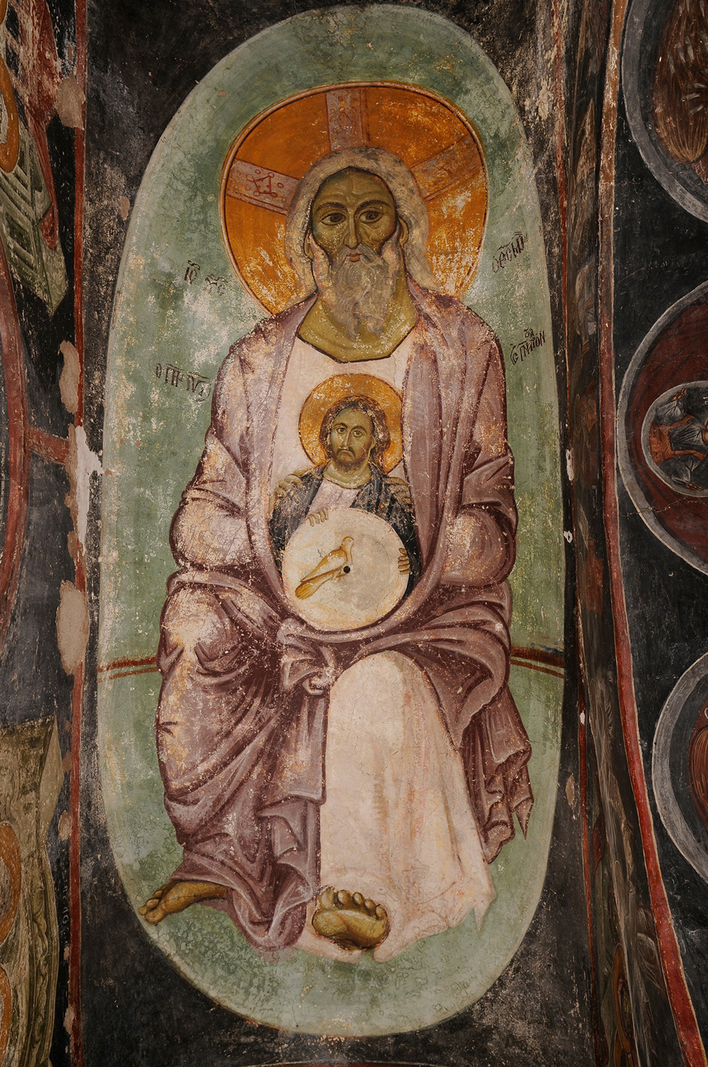 Πρόκειται για σπάνια απεικόνιση της ανθρωπόμορφης Αγίας Τριάδας, που βρίσκεται στην καμάρα του εσωνάρθηκα του μνημείου.