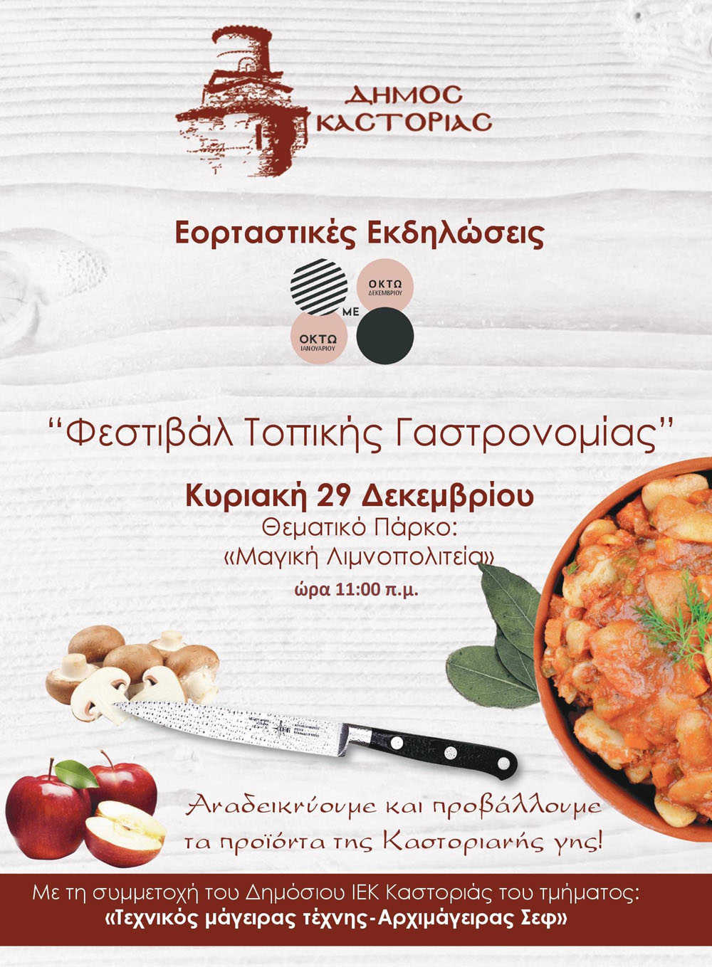 Μία ακόμη πρωτότυπη εκδήλωση, που διοργανώνει η νέα Δημοτική Αρχή, στο πλαίσιο των Εορταστικών Εκδηλώσεων 8με8, με τη συμμετοχή του Δημόσιου ΙΕΚ Καστοριάς, του τμήματος «Τεχνικός μαγειρικής τέχνης – Αρχιμάγειρας Σεφ», με σκοπό την ανάδειξη και προβολή των τοπικών προϊόντων.