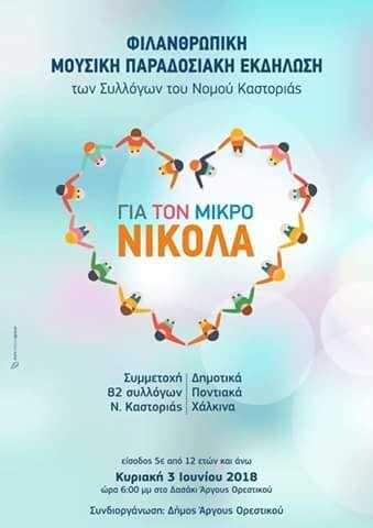 Την Κυριακή 3 Ιουνίου2018 και ώρα 18:00 οι Σύλλογοι του Νομού Καστοριάς με την υποστήριξη του Δήμου Άργους Ορεστικού διοργανώνουν φιλανθρωπική παραδοσιακή μουσική συναυλία στο Δασάκι Άργος Ορεστικού ‘’Για τον μικρό Νικόλα’’ με τιμή εισόδου 5,00€ (Παιδιά Δημοτικού Δωρεάν).