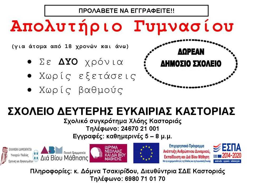 Οι εγγραφές στο Σχολείο Δεύτερης Ευκαιρίας Καστοριάς άρχισαν!