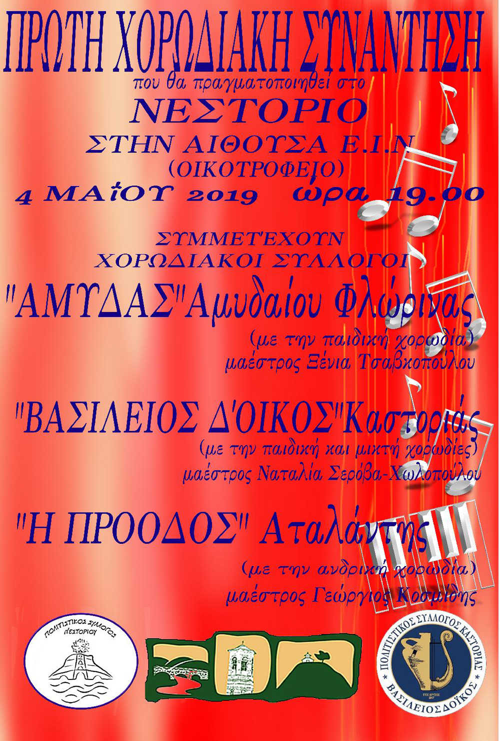 Ο Πολιτιστικός Σύλλογος “Βασίλειος Δόϊκος”, ο Πολιτιστικός Σύλλογος “Νέστωρ” Νεστορίου και ο Δήμος Νεστορίου σας προσκαλούν στην Πρώτη Χορωδιακή Συνάντηση που θα πραγματοποιηθεί στο ΝΕΣΤΟΡΙΟ στην αίθουσα Ε.Ι.Ν (Οικοτροφείο) το Σάββατο 4 Μαίου 2019 ώρα 19:00