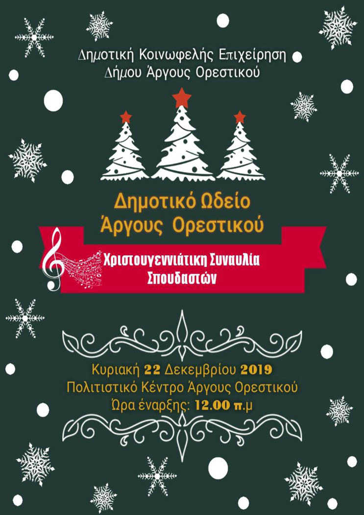 Η Δημοτική Κοινωφελής Επιχείρηση Δήμου Άργους Ορεστικού σας προσκαλεί στη Χριστουγεννιάτικη Συναυλία των σπουδαστών του Δημοτικού Ωδείου, την Κυριακή 22 Δεκεμβρίου και ώρα 12:00, στο Πολιτιστικό Κέντρο Άργους Ορεστικού.