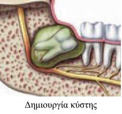 • Σπάνια μπορεί να δημιουργηθει μία κύστη με υγρό ή ακόμα και κάποιος όγκος γύρω από τον φρονιμίτη. Όσο μεγαλώνει η βλάβη οδηγεί σε πιο σοβαρά προβλήματα διότι κάνει ζημιά σε διπλανά δόντια, σε νεύρα και άλλα ανατομικά στοιχεία και αδυνατίζει το κόκκαλο της γνάθου.