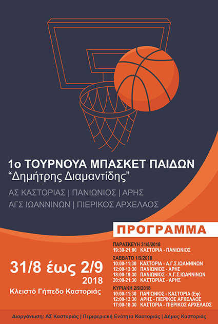 Συνδιοργανωτές του 1ο ΤΟΥΡΝΟΥΑ ΜΠΑΣΚΕΤ ΠΑΙΔΩΝ «ΔΗΜΗΤΡΗΣ ΔΙΑΜΑΝΤΙΔΗΣ» είναι οι: A.Σ. ΚΑΣΤΟΡΙΑΣ – ΠΕΡΙΦΕΡΙΑΚΗ ΕΝΟΤΗΤΑ ΚΑΣΤΟΡΙΑΣ – ΔΗΜΟΣ ΚΑΣΤΟΡΙΑΣ.