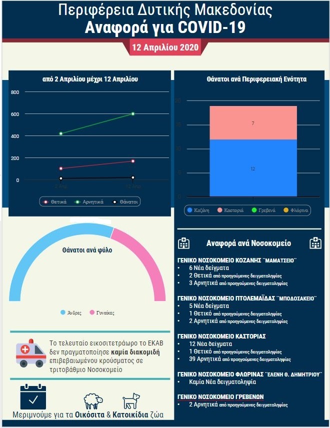 Η Περιφέρεια Δυτικής Μακεδονίας δίνει στη δημοσιότητα αναλυτικά την εξέλιξη των κρουσμάτων κορωνοϊού. Η εικόνα ως προς τα κρούσματα και τα ύποπτα κρούσματα για κορωνοϊό στην Δυτική Μακεδονία σήμερα (Κυριακή, 12 Απριλίου 2020) στα νοσοκομεία της Περιφέρειας έχει ως εξής: