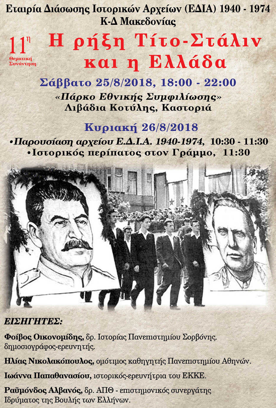Εβδομήντα χρόνια έχουν περάσει από το 1948 και τη ρήξη Τίτο-Στάλιν. Τα κρίσιμα ιστορικά ζητήματα της περιόδου και ο αντίκτυπός τους στα ελληνικά πράγματα θα αναλυθούν στη διημερίδα της ΕΔΙΑ Κ.-Δ. Μακεδονίας 1940-1974, στο «Πάρκο Εθνικής Συμφιλίωσης», στα Λιβάδια Κοτύλης, Καστοριά, στις 25 κ 26 Αυγούστου 2018.