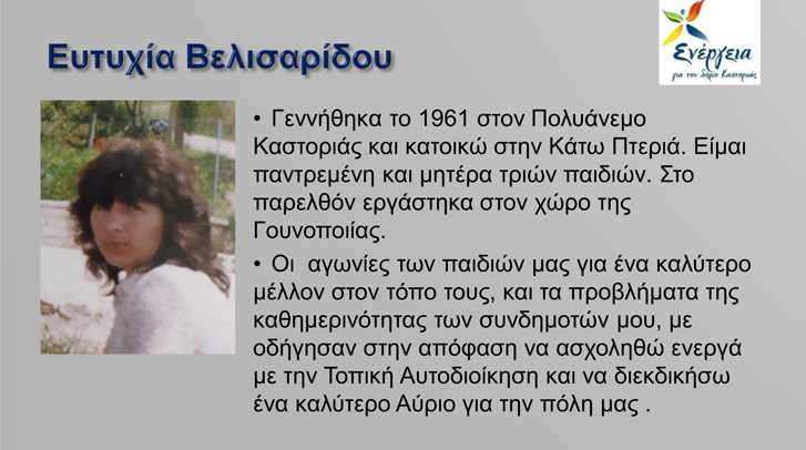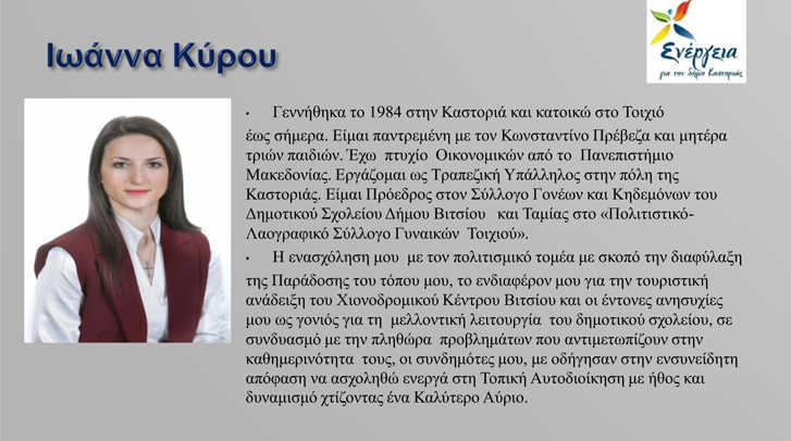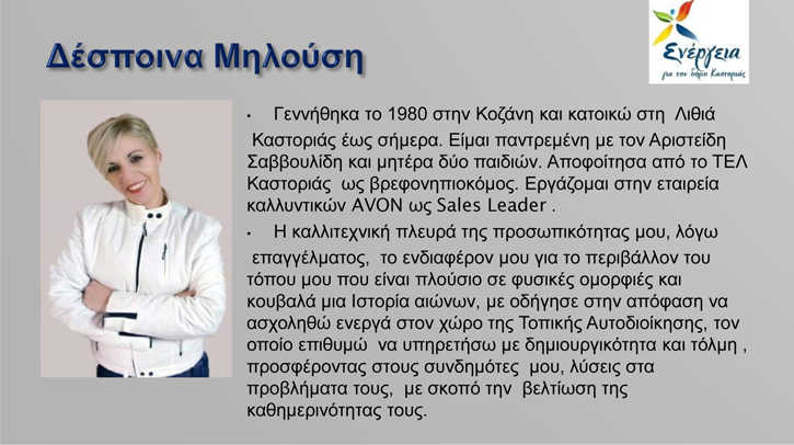 Η Υποψήφια Δήμαρχος της Δημοτικής Κίνησης «Ενέργεια για τον Δήμο Καστοριάς» κα Κατερίνα Σπύρου ανακοινώνει άλλους 18 υποψήφιους του συνδυασμού της και δηλώνει ακόμη πιο δυνατή.