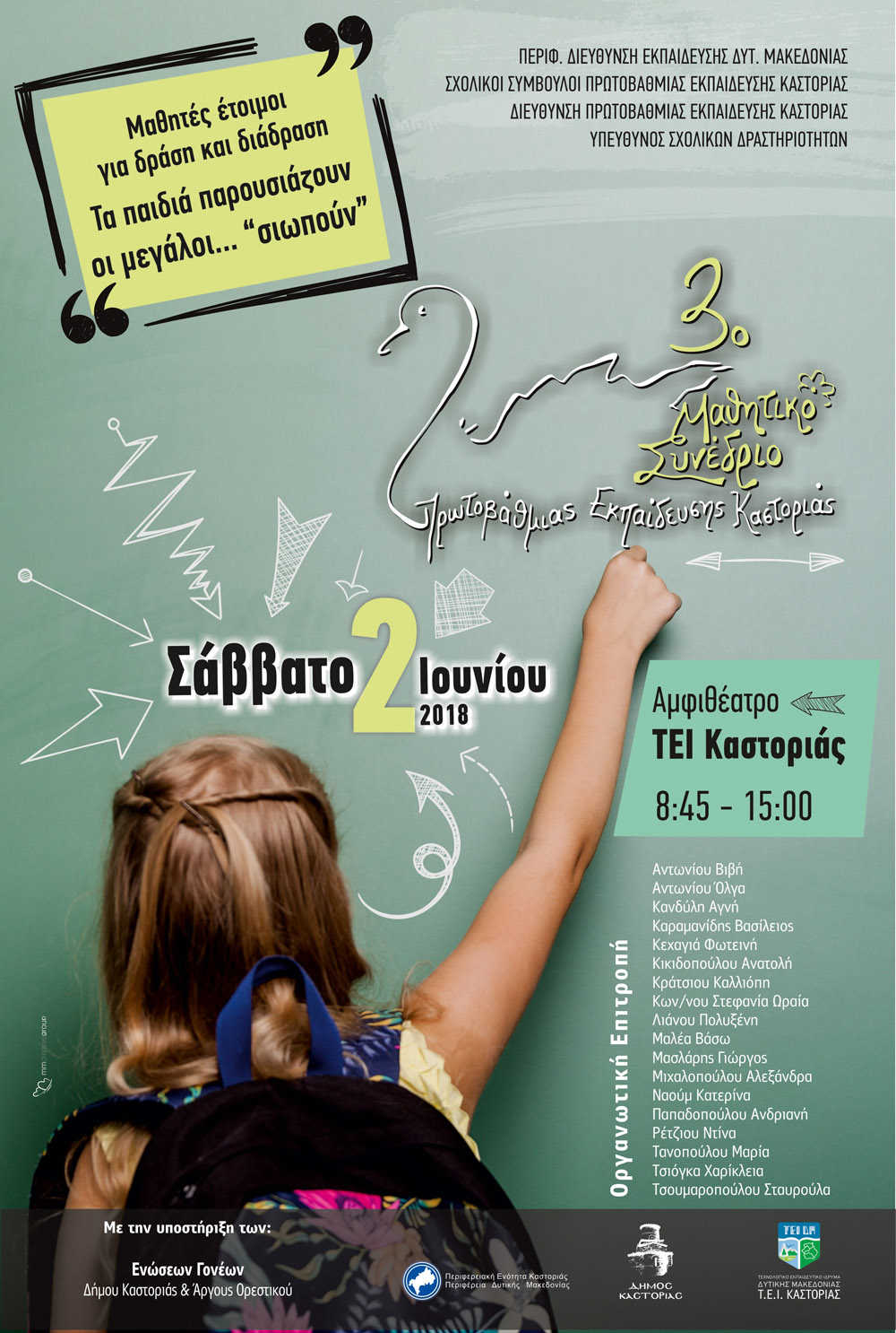 Το Σάββατο 2 Ιουνίου θα πραγματοποηθεί στο Αμφιθέατρο του ΤΕΙ Καστοριάς, το 3ο Μαθητικό Συνέδριο Πρωτοβάθμιας Εκπαίδευσης Καστοριάς