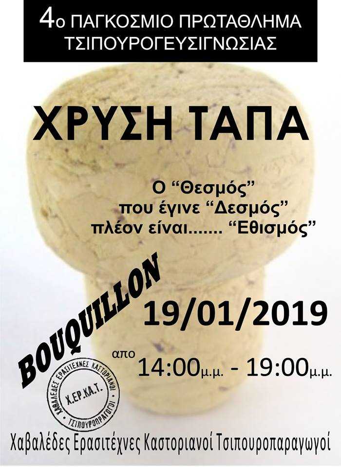 Οι Χ.ΕΡ.ΚΑ.Τ. σας προσκαλούν στο 4ο κατά σειρά Παγκόσμιο Πρωτάθλημα Τσιπουρογευσιγνωσίας “ΧΡΥΣΗ ΤΑΠΑ” που θα πραγματοποιηθεί το Σάββατο 19/1 στο Bouquillon!