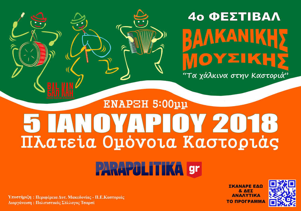 Την Παρασκευή 5 Ιανουαρίου 2018 και από ώρα 5:00μμ θα πραγματοποιηθεί για 4η συνεχόμενη χρονιά το Φεστιβάλ Βαλκανικής Μουσικής στην πλατεία Ομόνοια της Καστοριάς.