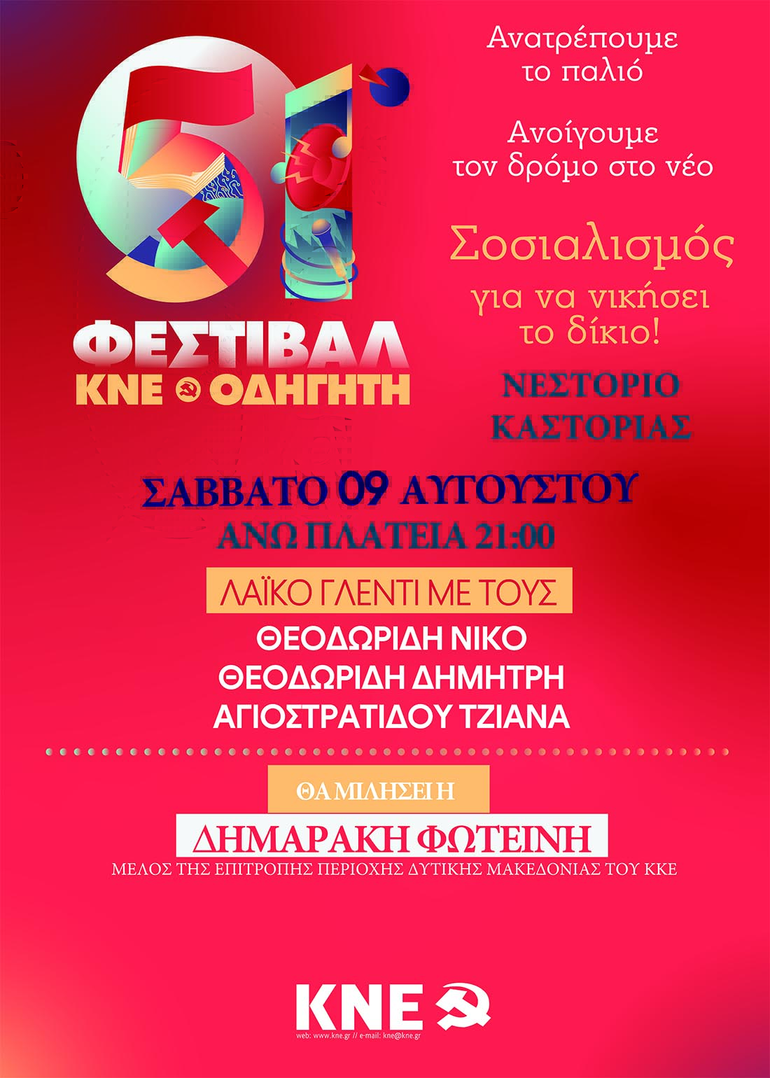 Με σύνθημα «Ανατρέπουμε το παλιό, ανοίγουμε το δρόμο στο νέο. Σοσιαλισμός για να νικήσει το δίκιο!», το 51ο Φεστιβάλ ΚΝΕ – «Οδηγητή»κάνει στάση στο Νεστόριο Καστοριάς το Σάββατο 9/8 στην Άνω Πλατεία Νεστορίου.
