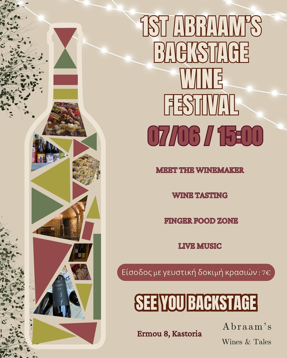 Το Abraam’s wines & tales, γιορτάζει τον πρώτο χρόνο λειτουργίας του διοργανώνοντας το πρώτο Backstage Wine Festival, το Σάββατο 7 Ιουνίου, σε μια ειδικά διαμορφωμένη πλατεία πίσω από τον χώρο του μαγαζιού.