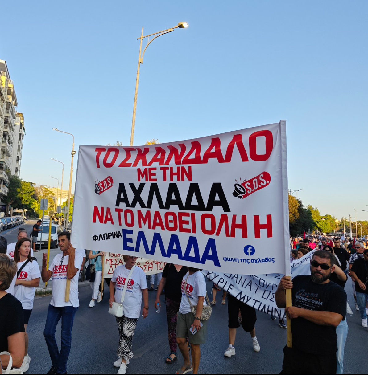 Ξεχώρισε η φωνή των κατοίκων της Αχλάδας που την τελευταία περίοδο βρίσκονται σε αγωνιστικές κινητοποιήσεις, διεκδικώντας την προστασία της υγείας και της ζωής τους απέναντι στην ασύδοτη δράση των εταιρειών που εκμεταλλεύονται τον ορυκτό πλούτο της περιοχής για να θησαυρίζουν με τις πλάτες του κράτους.
