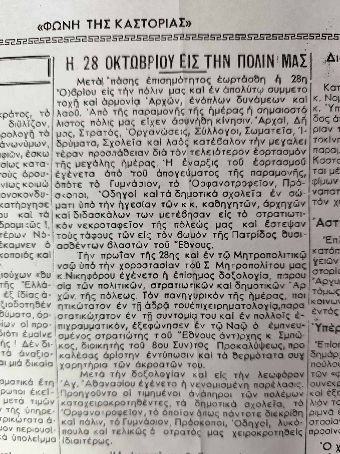 Ξημερώματα 28 Οκτωβρίου ακούστηκε η συνήθης οχλαγωγία που προκαλούσαν οι χωρικοί που έρχονταν για την αγορά. Ο πατέρας μου, εγώ κι ένας αδελφός μου κοιμόμασταν και κάποιος ενοχλητικός άνθρωπος τόλμησε και χτύπησε την πόρτα μας λέγοντας: «΄Ανθιμε σηκωθείτε, κηρύχτηκε πόλεμος». Ο πατέρας μου άρχισε να βρίζει, δεν ήθελεν ο μακαρίτης να ακούσει από αυτόν τον άνθρωπο την καταραμένη λέξη πόλεμος. Και από τότε άρχισε η τραγωδία του ελληνικού λαού εξαιτίας του φαμφαρόνη δικτάτορα της Ιταλίας Μουσολίνι. Εφημερίδες με μεγάλα γράμματα μας έκαναν γνωστό ότι σήμερα στις 3 το πρωϊ ξημερώματα 28 Οκτωβρίου 1940 ο Ιταλός πρεσβευτής στην Αθήνα Γκράτσι επέδωσε τελεσίγραφο στον ΄Ελληνα Πρωθυπουρργό Ιωάννη Μεταξά και ζητούσε να εισβάλουν τα ιταλικά στρατεύματα …