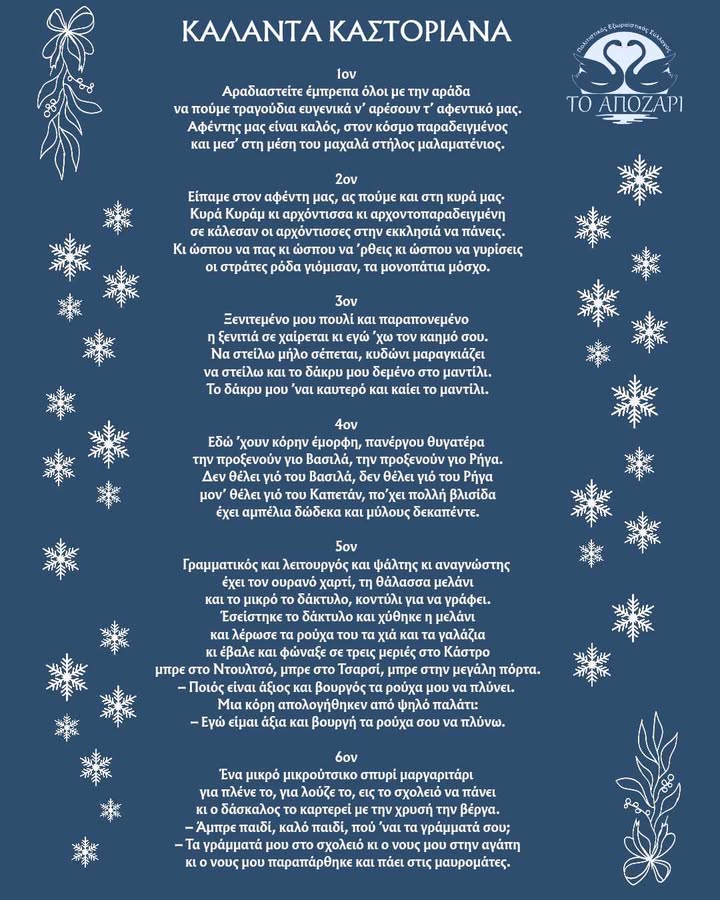 Ο Πολιτιστικός Εξωραϊστικός Σύλλογος «Το Απόζαρι » για άλλη μια φορά σας προσκαλεί να αναβιώσουμε μαζί το έθιμο των Καστοριανών Καλάντων, πόρτα πόρτα, με μελωδίες, ευχές και χριστουγεννιάτικη ζεστασιά.