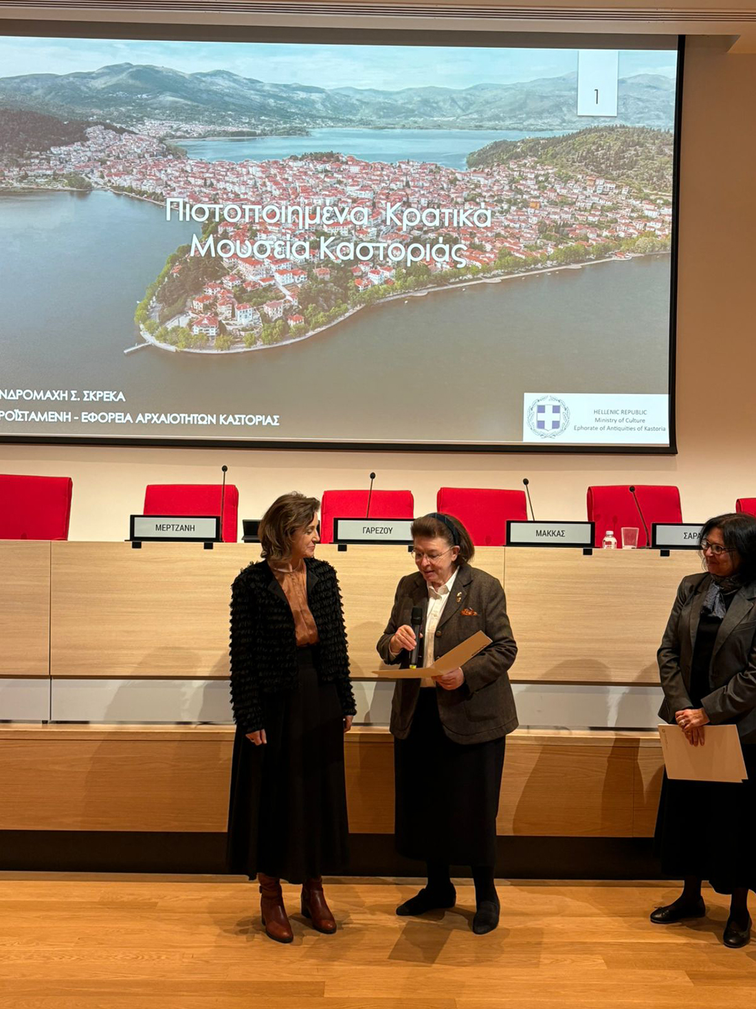 Η Λίνα Μενδώνη με την Προϊσταμένη της Εφορείας Αρχαιοτήτων Καστοριάς Ανδρομάχη Σκρέκα στην απονομή