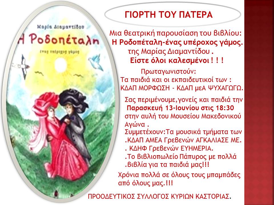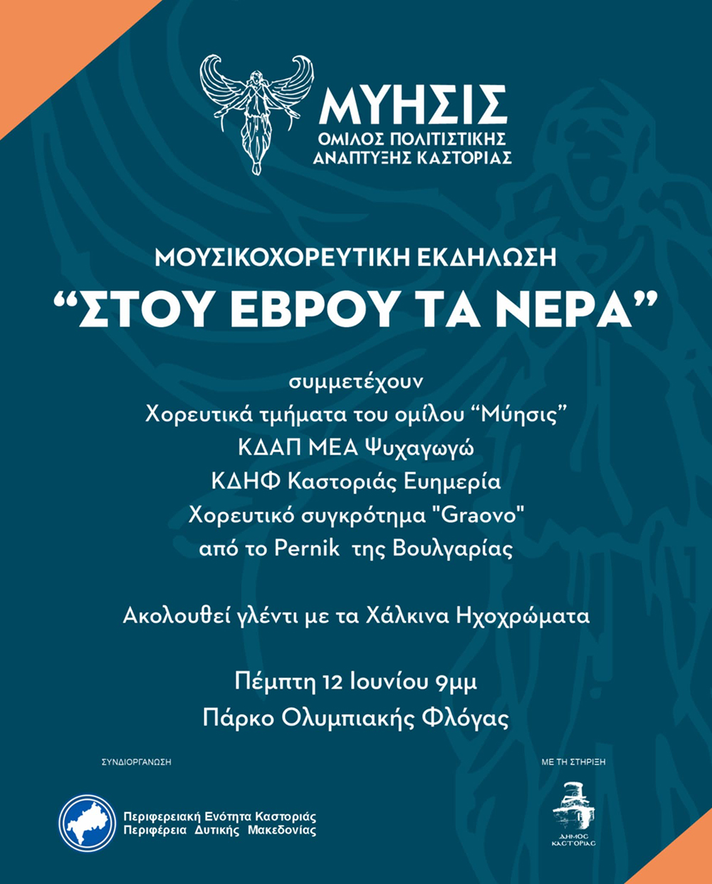 Μουσικοχορευτική εκδήλωση θα πραγματοποιηθεί από τον Όμιλο Πολιτιστικής Ανάπτυξης Καστοριάς «Μύησις» αφιερωμένη στην παράδοση της Θράκης. Εκτός από τα χορευτικά τμήματα του Ομίλου συμμετέχουν το ΚΔΑΠ ΜΕΑ «Ψυχαγωγώ», το ΚΔΗΦ «Ευημερία» και το χορευτικό συγκρότημα «Graovo» από το Πέρνικ της Βουλγαρίας.