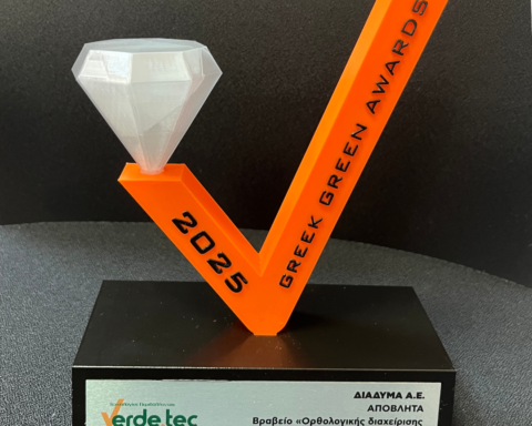 Για την πρωτοποριακή δράση, της Διαχείρισης των Επικίνδυνων Οικιακών Αποβλήτων βραβεύτηκε η ΔΙΑΔΥΜΑ