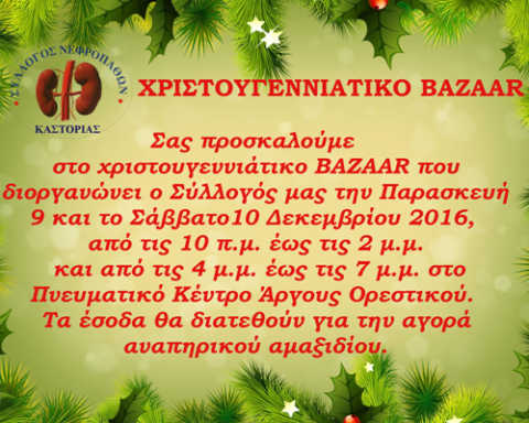 ΠερισσότεραΗ αγορά ενός αναπηρικού αμαξιδίου είναι ο σκοπός του χριστουγεννιάτικου μπαζάρ που διοργανώνει ο Σύλλογος Νεφροπαθών Καστοριάς. Η εκδήλωση που